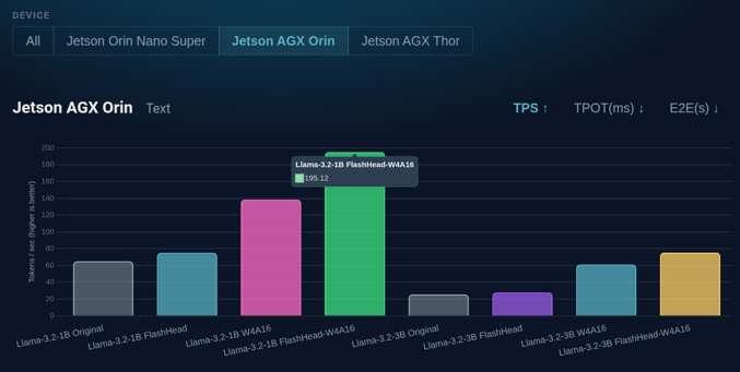 To get an extended and continually updated perspective on the performance of FlashHead, we have created a benchmarking space that includes all available models from the Cosmos Reason, Llama, Qwen, and Gemma series: